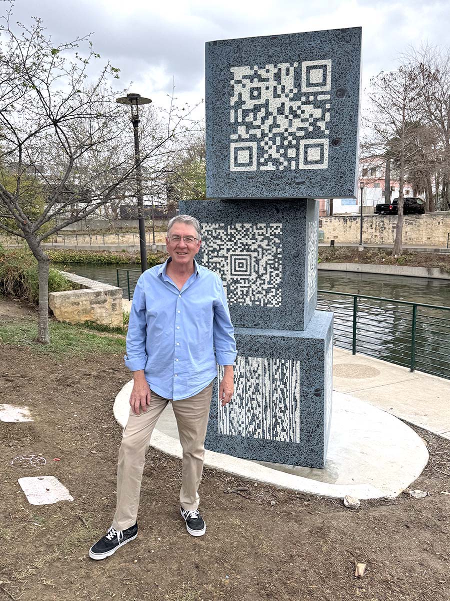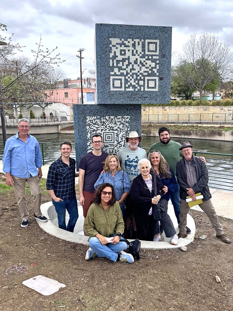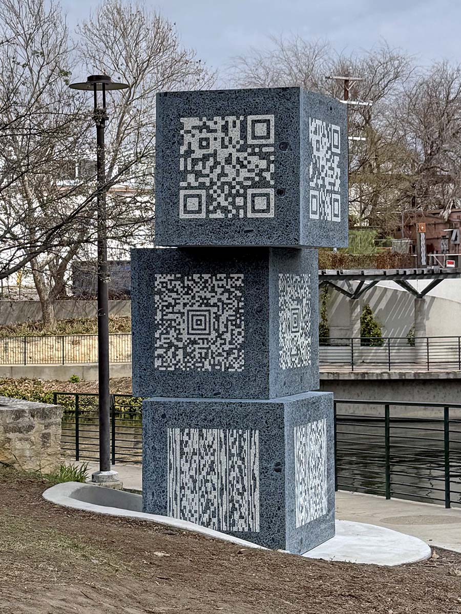 The glass from the river was sorted into light and dark fragments and were cast directly into the terrazzo faces. The bottles themselves create the contrast, and that contrast forms a pattern. Each face of each cube carries a working code called Aztec, QR and PDF417. Anyone with a smartphone can scan the codes and they link to the stories of the four honorees: Wayne, Lila Cockrell, Roberto Anguiano, and the Fay Sinkin Family. They also carry the river’s own narrative, in four panels, decoded straight from the glass.